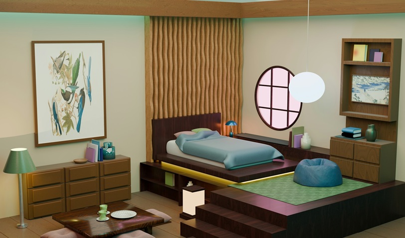 - Flooring: light wood or tatami mats for warmth and subtle texture.