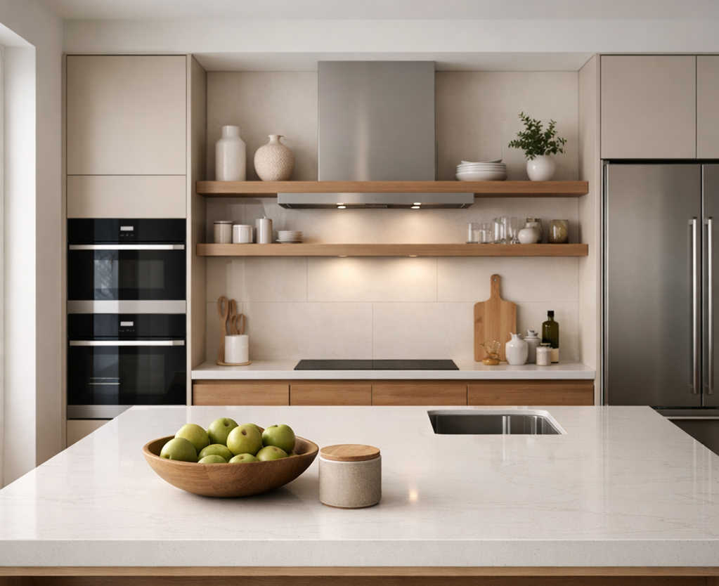 Quartz and sintered stone are durable, stain‑resistant, and available in many colors and patterns. They fit perfectly into a modern, low‑maintenance kitchen.